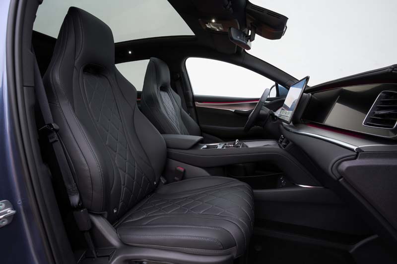 Per quanto riguarda gli interni la sensazione, al primo contatto, è quello di un tuffo a capofitto tra tecnologia, funzionalità e confort, trovando rivestimenti e materiali di ottimo livello, nonché il cluster digitale della strumentazione dal 10,25” e dotazioni irrinunciabili come i sedili anteriori elettrici riscaldati e ventilati, i sedili posteriori riscaldati, il clima bi-zona, la compatibilità Apple Car Play e Android Audio, con pure la ricarica wireless degli smartphone e altro. Con in primo piano il sistema multimediale e di infotainment con lo schermo touch da 15,6” a centro plancia, ruotabile di 90° per una perfetta visione orizzontale o verticale, che rappresenta il fulcro di riferimento per la navigazione, la telecamera a 360°, la gestione e il controllo di un’infinità di funzioni della vettura, nonché per l’audio system HiFi con 12 altoparlanti.