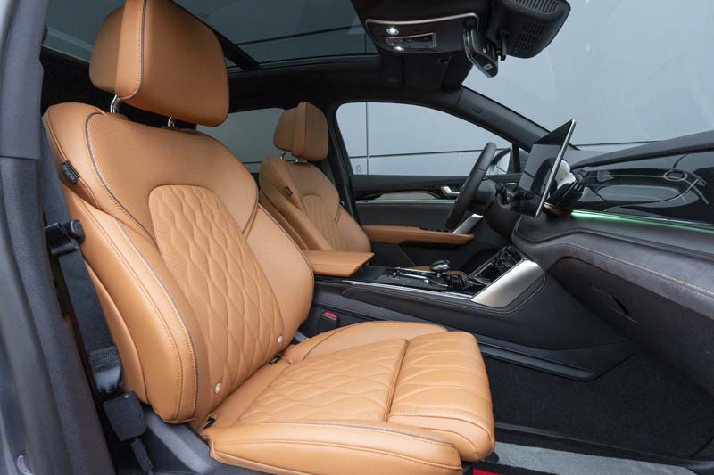 Gli interni, sono un vero e proprio festival di tecnologia, gadget e contenuti di ottimo livello. Da citare, in ordine sparso, i sedili in pelle nappa trapuntata di colore nero o marrone con funzioni massaggio, il funzionale cluster tuttofare della strumentazione, il nuovo sistema di infotainment con schermo da 15,6 pollici, ruotante che può posizionarsi sia orizzontale che verticale, il potente audio system Dynaudio con 12 altoparlanti, il luminoso tetto panoramico, l’illuminazione ambientale modulabile su ben 31 colori, il selettore del cambio illuminato.