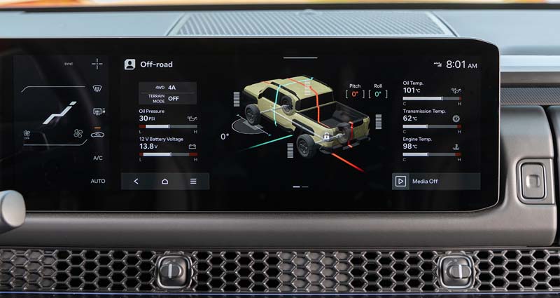 Gli interni mettono in primo piano una plancia “panoramica” che propone l’insieme di tre display, da quella della strumentazione da 12,3” a quello a segmenti da 5” per le info funzionali, a quello da 12,3” dedicato all’infotainment e all’interfaccia Connected Car Navigation cockpit abbinato al sistema di telecamere e all’audio system Harman Kardon.