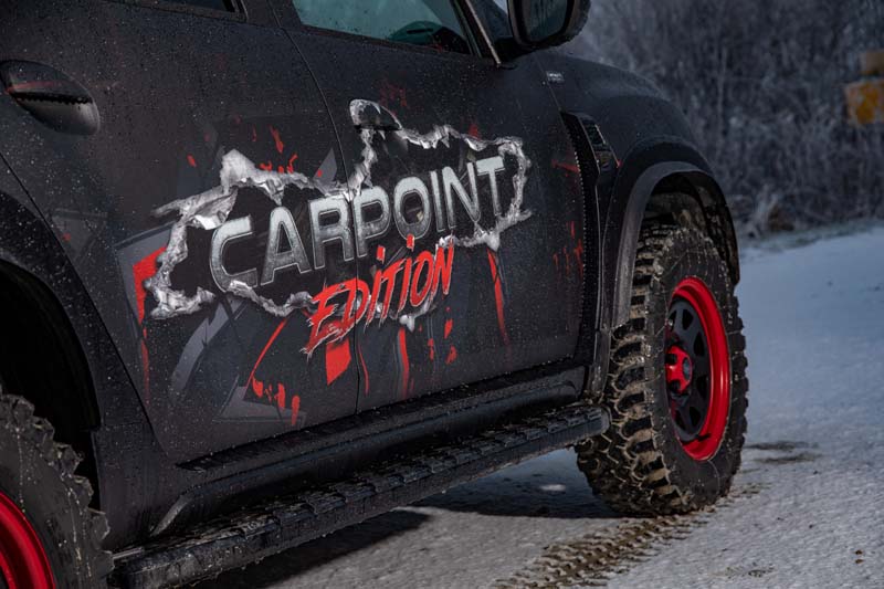Un Duster Dacia pronto a sfidare qualsiasi situazione off road, anche estrema, dalle fredde terre del nord ai più caldi e impegnativi deserti, alle langhe sperdute. Lo styling punta su un satinato carbon look della carrozzeria con in primo piano un vistoso wrapping logato Carpoint Edition. All’anteriore sono stati installati un bull bar in tubo d’acciaio verniciato nero carbon, lo skyd plate salva motore e un verricello elettrico occultato nel bumper. Al posteriore sono stati previsti un tubo di protezione analogo al bull bar anteriore e il gancio di traino omologato.