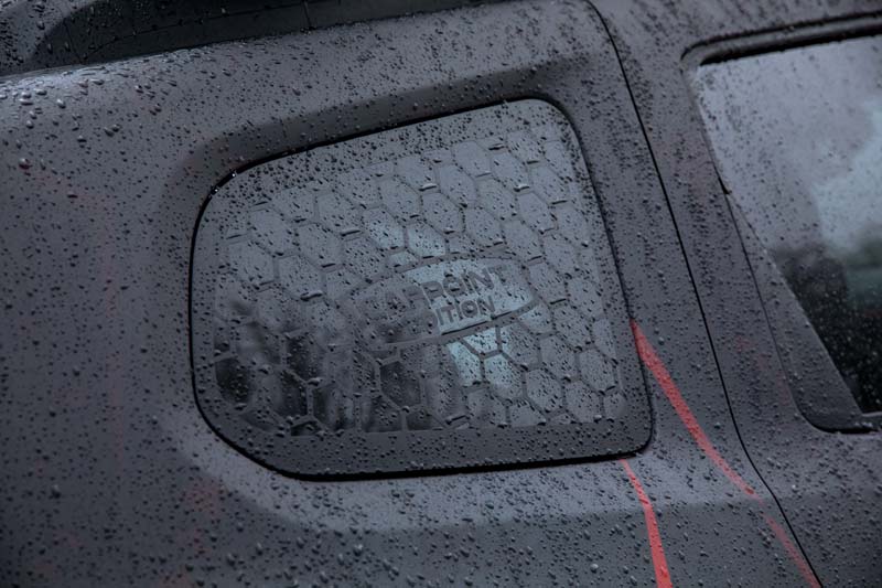 Lateralmente, ben in evidenza, ci sono le protezioni antincastro in acciaio inossidabile, con funzione di pedane d’accesso, i cerchi in acciaio Dotz neri, con cornice e calotta centrale verniciati in rosso, mentre gli pneumatici da off road sono gli Insa Dakar Turbo Desert Track da 235/50 R16.
