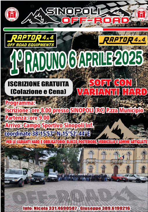 Prima edizione del Raduno nazionale organizzato dal Sinopoli Off Road club. L’evento, di tipo classico turistico si svilupperà su un erpcorso con difficoltà di tipo medio superabili da tutti i fuoristrada con ridotte e dotati  gomme da fango, radio CB, trip-master, accessori per il recupero. Poiché lungo il tracciato sono previste alcune situazioni tecniche il club si riserva di deciudere quali veicoli siano adatti ad affrontarle in base alle dotazioni. Prevista una sosta ristoro a fine percorso. L’evento si svolgerà con l’ausilio di un road book cartaceo.
