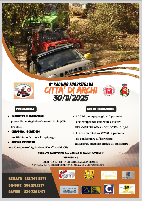 Nona edizione del classico Raduno Città di Archi, organizzato dal Club Fuoristrada Frentano. Si tratta di un evento classico, adatto a tutti i fuorstrada con ridotte, che propone un tracciato di tipologia media guidato con un road book cartaceo e che prevede anche una variante facoltativa di maggior impegno e da ben guidare.