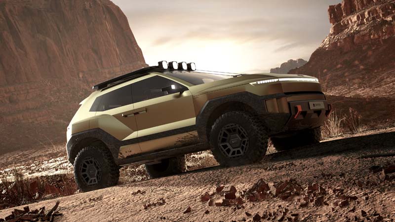 Una muscolosità espressa anche dagli elementi protettivi, dagli angoli caratteristici very off road, dal corpo vettura con luce libera da terra alta sulle ruote, con i cerchi da 18” calzati con pneus da 33” dal particolare battistrada aggressivo e “grippante”. Con pure le irrinunciabili luci ausiliare sul tetto, il robusto portapacchi e la particolarità di dotazioni inedite come le telecamere inserite nei retrovisori, che all’occorrenza diventano torce elettriche estraibili, oppure il gancio di recupero integrato che diventa apribottiglie.