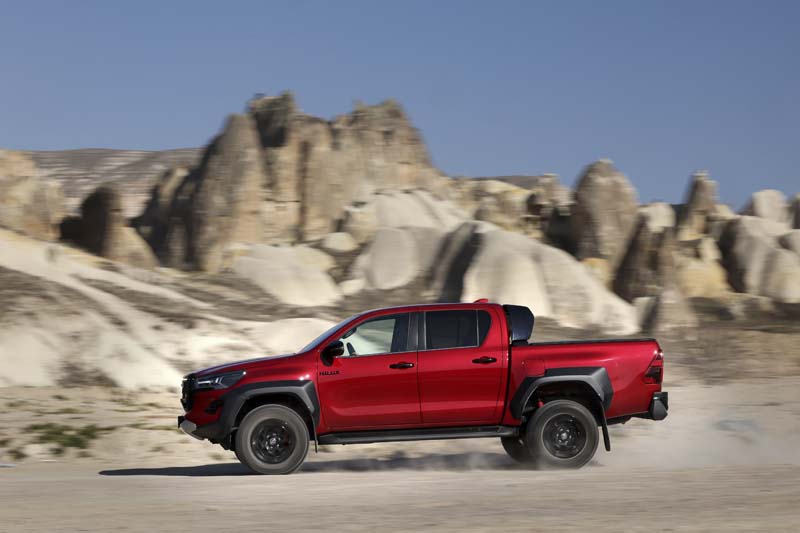 Ma c’è di più perchè “sotto il vestito” l’Hilux GR Sport II propone carreggiate allargate di 135 mm all’anteriore e di 155 mm al posteriore, e un assetto rivisitato negli ammortizzatori e negli elementi sospensivi, con l’aggiunta di una barra antirollio più leggera. Un assetto riconfigurato che vale anche un miglioramento della luce libera da terra (di 323 mm) e dell’angolo d’attacco (aumento a 30°).