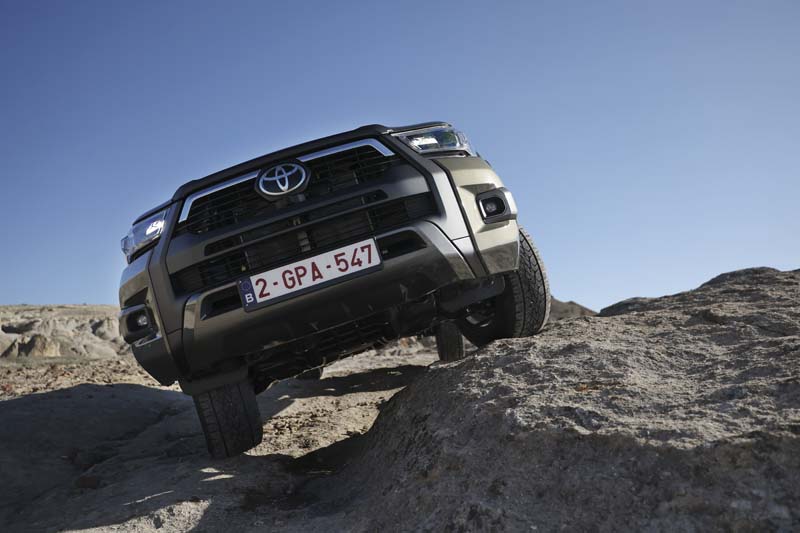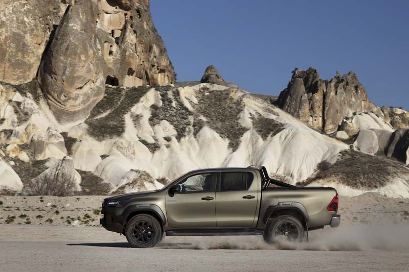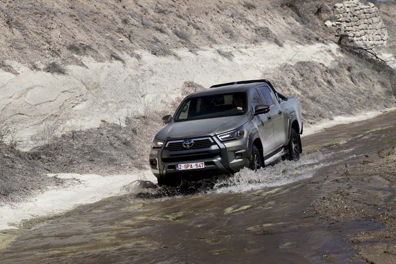 Se su strada l’Hilux elettrificato esprime caratteristiche di guida fluide ma di valida reattività, paragonabili a quelle di un Suv, è nell’ottica del fuoristrada che esprime al meglio le doti di agilità e prestanza, grazie ad una particolare attenzione dedicata agli aspetti off road che, tra l’altro, hanno portato i progettisti a ben “posizionare” gli elementi elettrici, la batteria e il convertitore in posizione alta e protetta. Il tal modo l’Hilux Hybrid 48V è in condizione di affrontare e superare le più impegnative situazioni ambientali, come i guadi sino a 700 mm, le forti pendenze e i terreni sconnessi e problematici. Ciò grazie anche all’adozione, per la prima  volta su questo modello, del sistema Multi-Terrain-Select per il controllo e l’ottimizzazione della motricità in ogni situazione attraverso  il cambio automatico a 6 rapporti e alle 6 modalità di guida selezionabili. Tra le caratteristiche off road che si fanno apprezzare c’è l’altezza da terra di 310 mm e l’angolo di attacco e uscita che sono rispettivamente di 29 e 26 gradi.