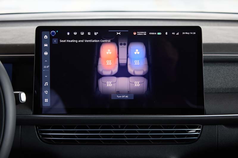 Stile minimalista anche per gli interni con una plancia a sviluppo orizzontale. semplice ma ben delineata, dove si pongono all’attenzione il volante strutturato, il cluster della strumentazione, da 10,2”, posizionato davanti al pilota, e il display da 14,96” dell’infotainment e della multimedialità che serve anche a gestire tutte le funzione e i servizi del veicolo poiché non sono previsti i classici pulsanti o comandi fisici.