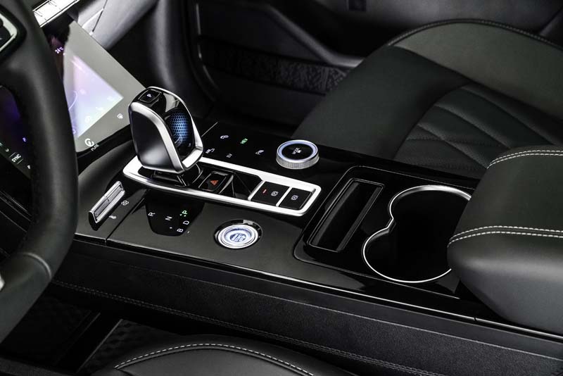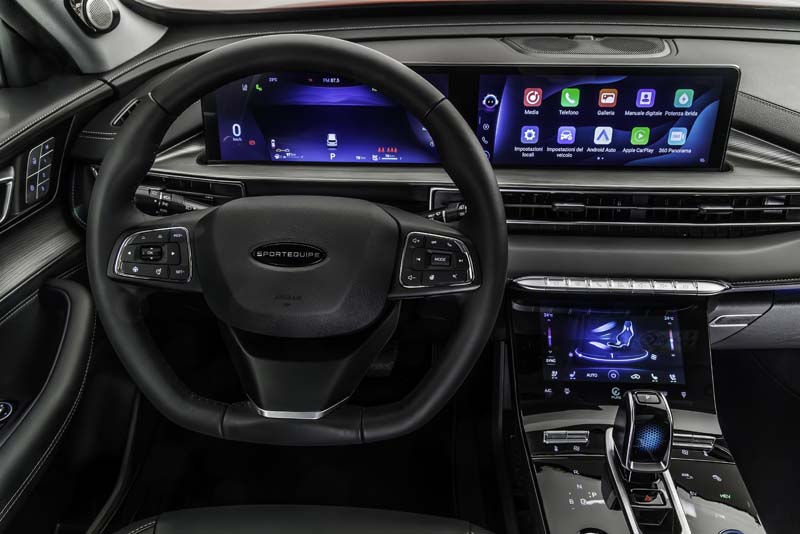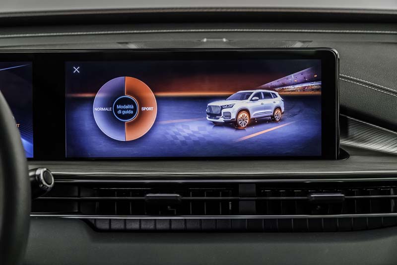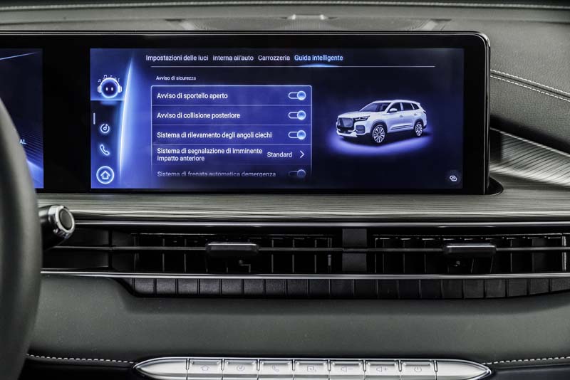 Il tunnel centrale oltre al cambio DHT e i comandi di commutazione tra full electric ed Hybrid, ospita anche il touch LCD da 9” della climatizzatore bi-zona, che prevede un sistema di purificazione dell’aria. Nelle dotazioni figurano anche i cerchi in lega da 20” e un completo sistema di ADAS di secondo livello per la sicurezza e l’assistenze alla guida.