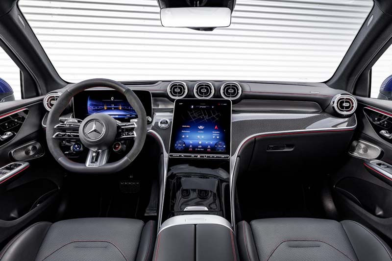 Parliamo di design e stile con gli elementi distintivi della sportività AMG, che valorizzano entrambe le versioni. Con il frontale forte, la particolare griglia radiatore a listelli verticali, la grembialatura anteriore AMG, con i flics e le prese d’aria che indirizzano i flussi a soddisfare le varie funzioni, i particolari cromati. Senza trascurare le soglie laterali integrate e qualche differenza identificativa tra i due modelli che per la GLC 43 vede la grembialatura posteriore in stile diffusore con due doppi terminali di scarico rotondi, mentre per la GLC 63 c’è un pannello diffusore aggiuntivo,  con  terminali di scarico trapezoidali.