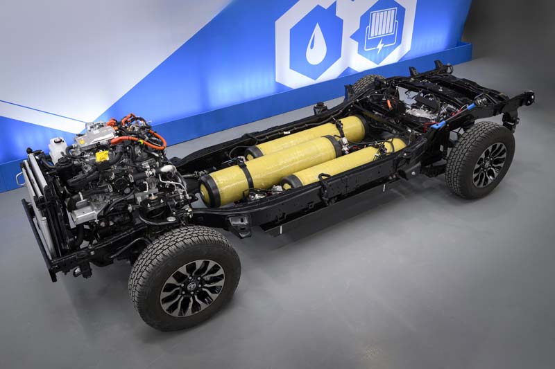 Nel fisico, nella sagoma e negli oltre cinque metri di lunghezza del classico pick up giapponese, in versione Extra Cab e con ampio cassone, sono stati utilizzati e inseriti gli elementi e il gruppo propulsore, ampiamente collaudato da oltre dieci anni di utilizzo, che equipaggia la Toyota Mirai, berlina elettrica, a celle a combustibile a idrogeno, quanto mai apprezzata per la sua versatilità e il suo rispetto ambientale, grazie alle “emissioni zero” garantite del suo sistema che allo scarico emette solamente acqua pura.