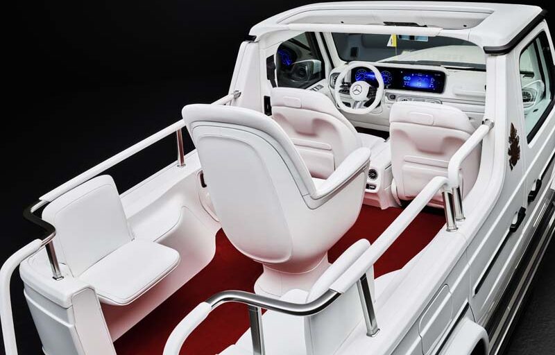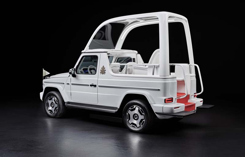 Il tutto comandato dall’elettronica per gestire, come sulla versione elettrica originale, i rapporti di trasmissione simulati per High Range, Low Range ed eventuali altre necessità di guida. La nuova Papamobile è stata consegnata al Papa da Ola Källenius, CEO di Mercedes Benz, accompagnato da un’ampia delegazioni di esperti.
